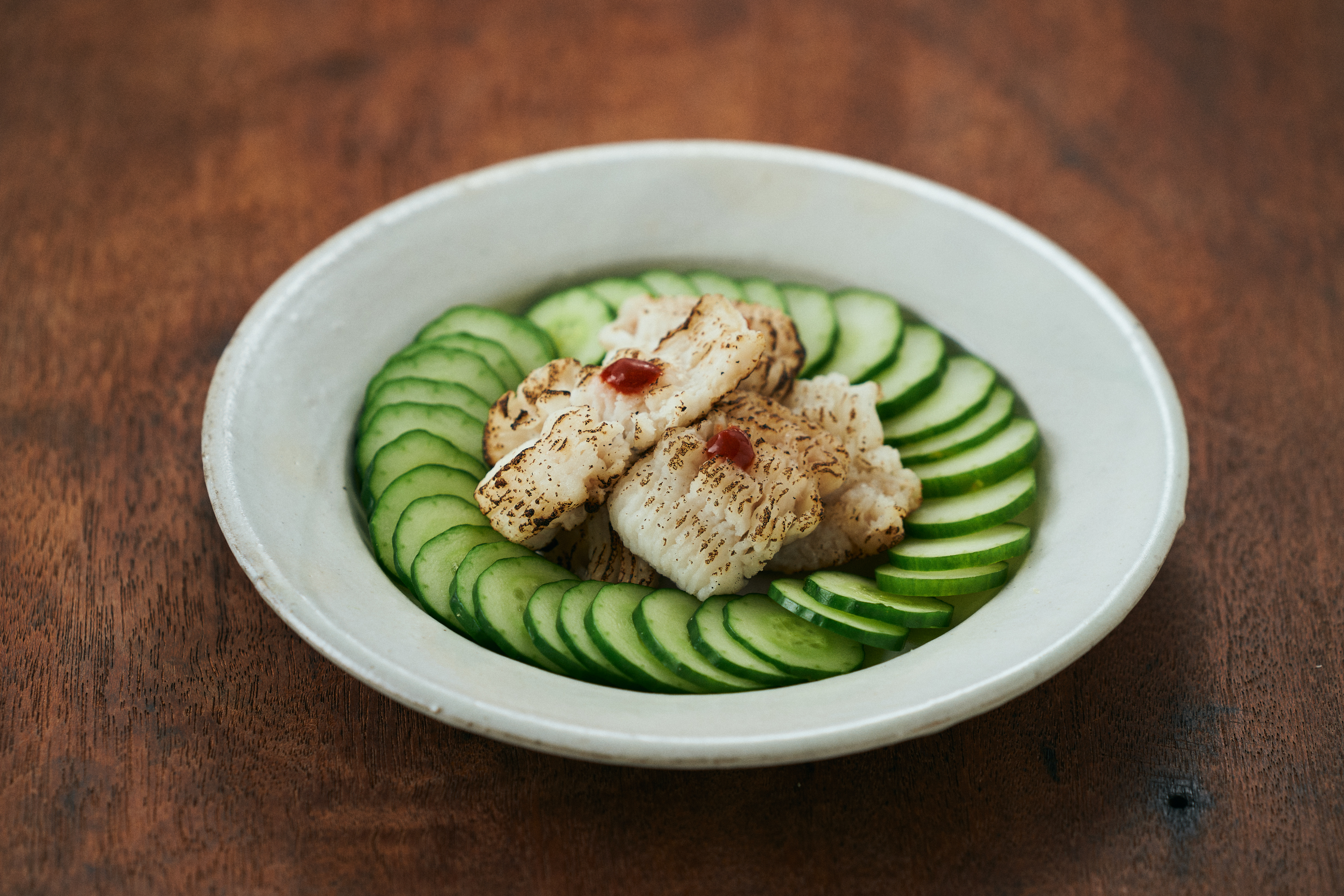 目の前の橘湾で水揚げされたハモを弊社で活き〆にして湯引きにし、表面を香ばしく炙っています。
